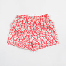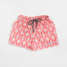 Bañador de niño con estampado tipo Ikat mallorquín en tonos rojos, grises y blancos. Lleva forro interior, bolsillo trasero y cordón en tono gris. El tejido de éste bañador es de secado rápido.