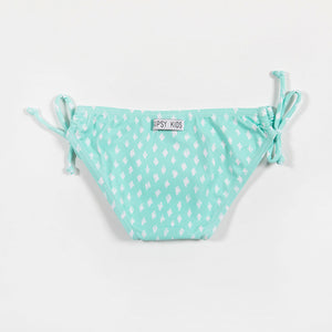 Culetín de niña turquesa con estampado blanco. Lleva dos lazos en cada lado para poder regular el tamaño que se desee. Lleva forro.